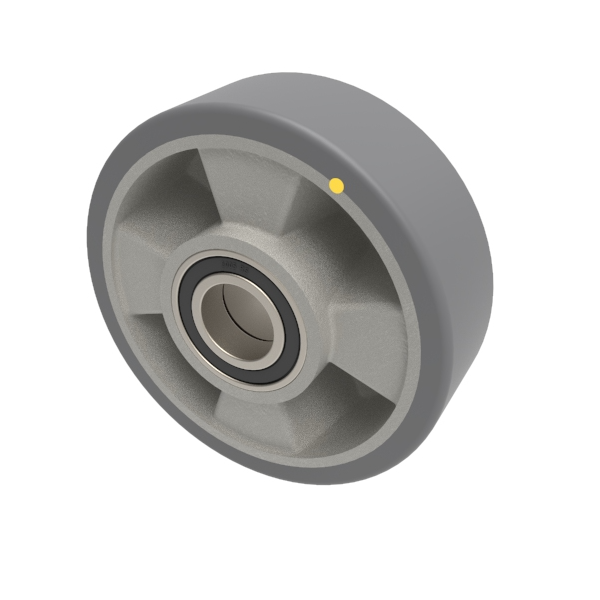 Grey anti-static polyurethane tyre on aluminium centred wheel with ball bearings. Diameter 125mm, tread width 40mm, bore size 25mm, hub length 50mm. Load capacity 240kg. Antistaticity equal to 5x10*7 Ohm. conforms to BS 2050:1978
