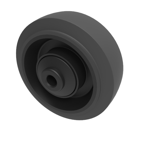 Black 65 shore A elastic rubber tyre on black nylon centred wheel with a ball bearing. Diameter 100mm, tread width 36mm, bore size 10mm, hub length 49mm. Load capacity 200kg. REACH compliant also PAH-Free rubber to confirm to EU-directive 2005/69/EC