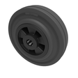 Black solid rubber tyre on polypropylene centre with a roller bearing. Diameter 125mm, tread width 37.5mm, bore size 15mm, hub length 45mm. Load capacity 90kg.