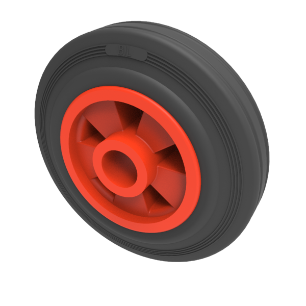 160mm black rubber tyre on red polypropylene centre with plain bearing. Tread width 40mm, Bore size 25.4mm, hub length 51mm. Load capacity 140kg.