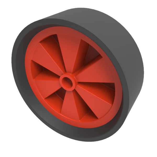 Red centred black crumb rubber tyred wheel. Wheel diameter 260mm, tread width 95mm, bore 25.4mm, hub 59mm. Load capacity 125kg.