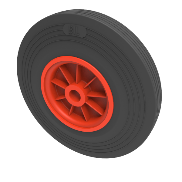 Black rubber tyre on red polypropylene centred wheel. Diameter 300mm, tread width 54mm, bore size 25.4mm, hub length 51mm.Load capacity 280kg.