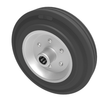 Black rubber tyre on a pressed steel centred wheel with a roller bearing. Diameter 200mm, Tread width 46mm, bore 20mm, hub 60mm. Load capacity 205kg.