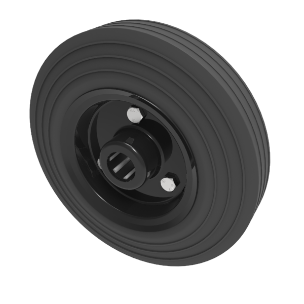Black rubber tyre on steel disc centre with a roller bearing. Diameter 200mm, tread with 45mm, bore size 25.4mm, hub length 51mm. Load capacity 205kg for non towing applications.