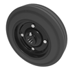 Black rubber tyre on steel disc centre with a roller bearing. Diameter 250mm, tread width 60mm, bore size 25.4mm, hub length 51mm. Load capacity 350kg.for non towing applications.