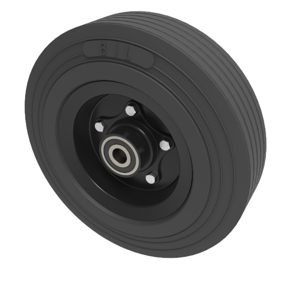Black rubber tyre on steel disc centre with ball bearings fitted. Diameter 300mm, tread width 80mm, 20mm ball bearings, hub length 75mm. Load capacity 400kg.for non towing applications.