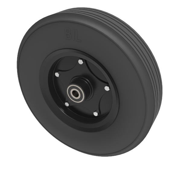 Black rubber tyre on steel disc centre with a ball bearing. Diameter 400mm, tread width 100mm, bore size 20mm, hub length 75mm, load capacity 700kg.for non towing applications.