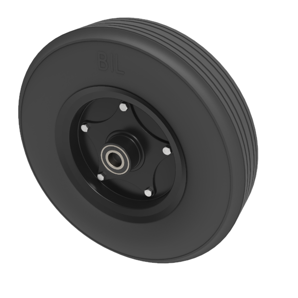 Black rubber tyre on steel disc centre with a ball bearing. Diameter 400mm, tread width 100mm, bore size 25mm, hub length 75mm, load capacity 700kg.for non towing applications.