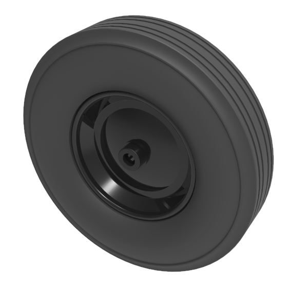 Black rubber tyre wheel on steel disc centre with roller bearing. Diameter 400mm, tread width 100mm, bore size 20mm, hub length 66mm, Load capacity 400kg.for non towing applications.
