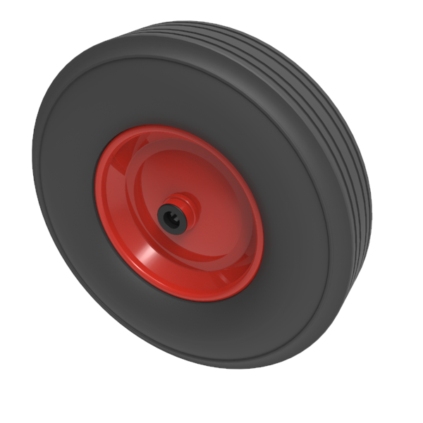 Black rubber tyred wheel on red steel disc centre with roller bearing.Diameter 400mm, tread width 100mm, bore size 20mm, hub length 66mm, Load capacity 400kg.for non towing applications.