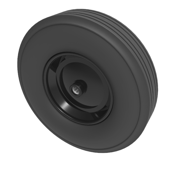 Black rubber tyred wheel on steel disc centre with roller bearing.Diameter 400mm, tread width 100mm, bore size 25.4mm, hub length 66mm, Load capacity 400kg.for non towing applications.