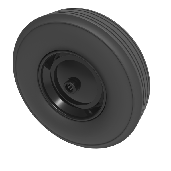 Black rubber tyre wheel on steel disc centre with roller bearing. Diameter 400mm, tread width 100mm, bore size 25mm, hub length 66mm, Load capacity 400kg.for non towing applications.