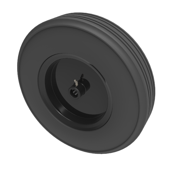 Black rubber tyre on a welded steel disc rim fitted with roller bearings and nylon retainers. Diameter 400mm, tread width 95mm, bore size 25mm, hub length 66mm. Load capacity 700kg. for non towing applications.