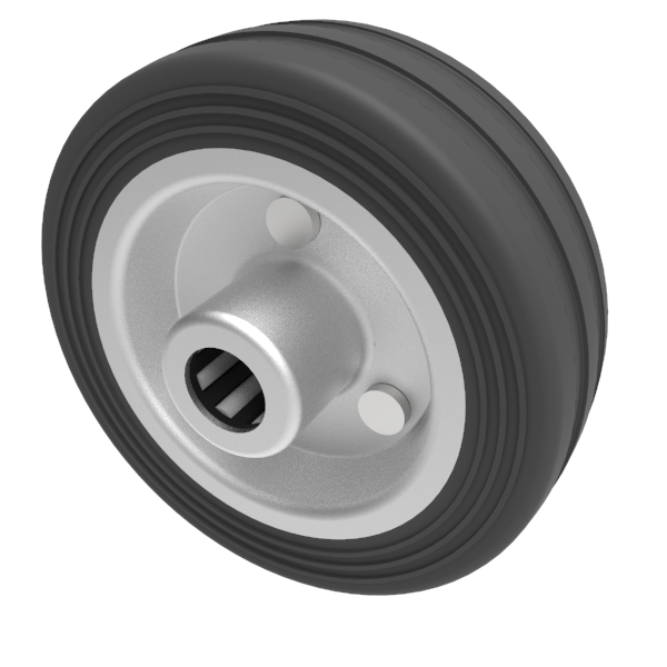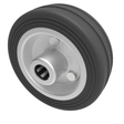 Black rubber tyre on steel disc centre with a roller bearing. Diameter 80mm, tread width 24mm, bore size 12mm, hub length 40mm. Load capacity 50kg.
