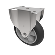 Pressed steel fixed castor with a top plate fixing fitted with a black high elastic natural 55 shore A round profile rubber tyred on an aluminium centred wheel with ball bearings. Wheel diameter 200mm, tread width 50mm, overall height 238mm, top plate 135mm x 115mm, hole centres 105mm x 80/75mm. Load capacity 400kg. REACH compliant also PAH-Free rubber to confirm to EU-directive 2005/69/EC, also available with flat tread details on request