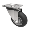 Pressed steel swivel castor with a top plate fixing fitted with black ergonomic high elastic natural 55 shore A round profile rubber tyre aluminium centred wheel with ball bearings. Wheel diameter 150mm, tread width 47mm, overall height 190mm, top plate 105mm x 86mm, hole centres 80mm x 60mm. Load capacity 250kg. REACH compliant also PAH-Free rubber to confirm to EU-directive 2005/69/EC