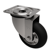 Pressed steel swivel castor with a top plate fixing fitted with a black high elastic natural 55 shore A round profile rubber tyred on an aluminium centred wheel with a ball bearing. Wheel diameter 200mm, tread width 50mm, overall height 238mm, top plate 135mm x 110mm, hole centres 105mm x 75mm/80mm. Load capacity 400kg. REACH compliant also PAH-Free rubber to confirm to EU-directive 2005/69/EC, also available with flat tread details on request
