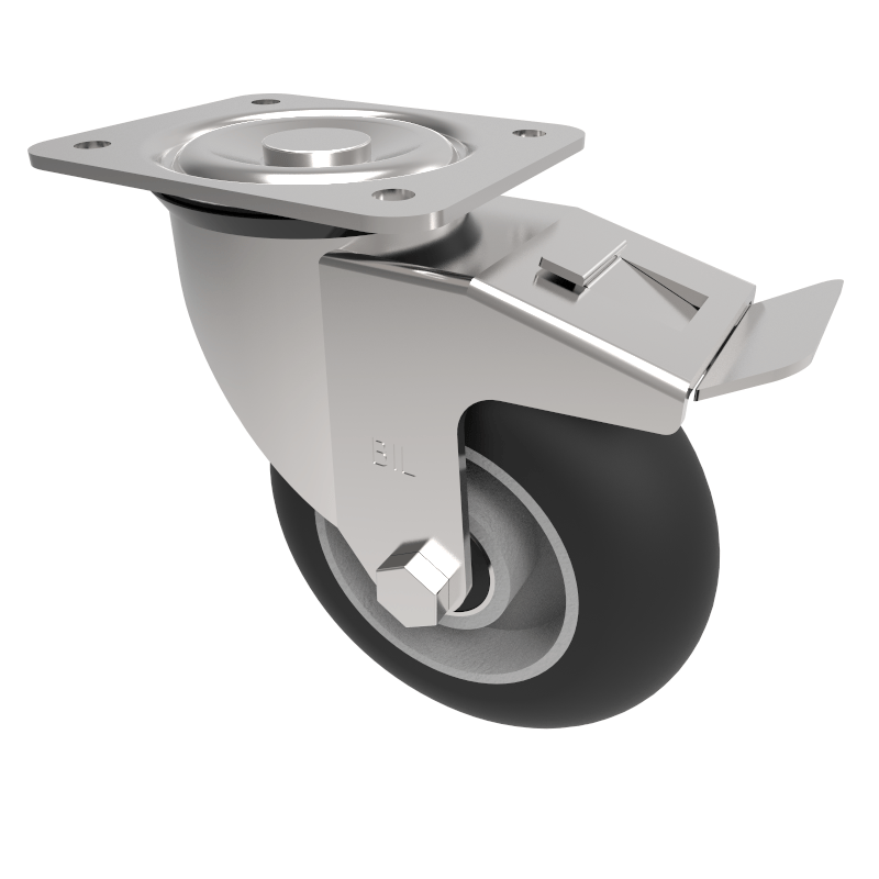 Pressed steel swivel castor with a top plate fixing fitted with a 65 shore A black ergonomic elastic rubber on aluminium centred wheel with ball bearing and total lock brake. Wheel diameter 125mm, tread width 40mm, overall height 156mm, top plate 135mm x 110mm,hole centres 105mm x 80mm or 116mm x 92.5mm Load capacity 200kg.g. REACH compliant also PAH-Free rubber to confirm to EU-directive 2005/69/EC