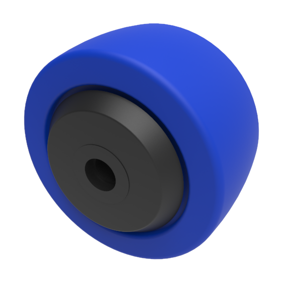Blue 65 shore A elastic rubber tyre on black nylon centred wheel with ball bearings. Diameter 100mm, tread width 50mm, bore size 12mm, hub length 63mm. Load capacity 275kg. REACH compliant also PAH-Free rubber to confirm to EU-directive 2005/69/EC