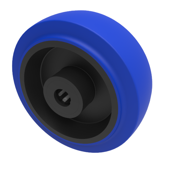 Blue 65 shore A elastic rubber tyre on black nylon centred wheel with a roller bearing. Diameter 100mm, tread width 36mm, bore size 12mm, hub length 40mm. Load capacity 200kg.REACH compliant also PAH-Free rubber to confirm to EU-directive 2005/69/EC
