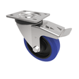 Pressed steel swivel castor with a top plate fixing with a 65 shore A blue elastic rubber tyre wheel with a black nylon centre with ball bearing and a total lock brake. Wheel diameter 125mm, tread width 50mm, overall height 165mm, top plate 105mm x 86mm, hole centres 80mm x 60mm. Load capacity 275kg. REACH compliant also PAH-Free rubber to confirm to EU-directive 2005/69/EC