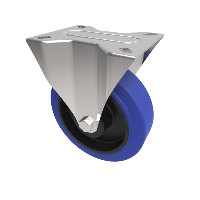 Pressed steel fixed castor with a top plate fixing fitted with a blue 75 shore A elastic rubber tyre on a black nylon centred wheel with a roller bearing. Wheel diameter 160mm, tread width 50mm, overall height 195mm, top plate 140mm x 110mm, hole centres 105mm x 80/75mm. Load capacity 300kg.