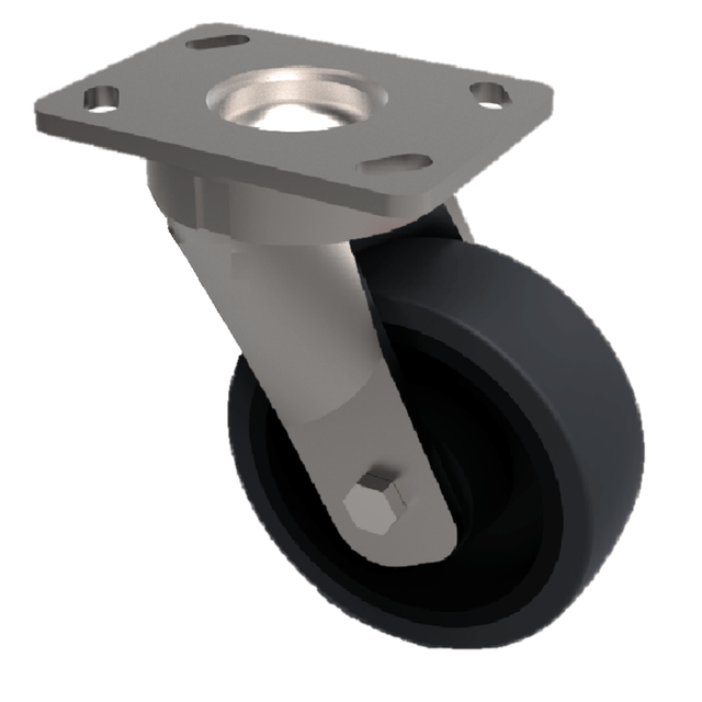 Fabricated swivel castor with a top plate fixing fitted with a black eleastic rubber on a black nylon centre with roller bearings. Wheel diameter 250mm, tread width 50mm, overall height 300mm, top plate 150mm x 110mm, hole centres 105mm x 80mm or 121mm x 59mm. Load capacity 500kgs.