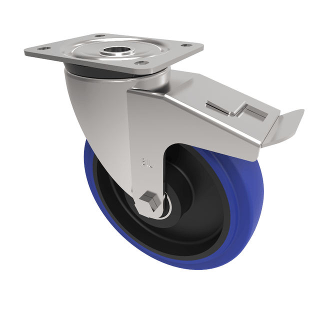 Blue Elastic Rubber 75ShoreA Plate Swivel Castor Brake 200mm 400kg Load