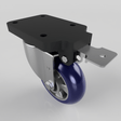 Pressed steel swivel castor with a top plate fixing fitted with a ergonomic blue 75 shore A polyurethane tyre on aluminium centred wheel with ball bearings and fixed position locked brake. Wheel diameter 150mm, tread width 50mm, overall height 204mm, top plate 135mm x 110mm, hole centres 105mm x 80mm. Load capacity 500kg at 4kph and 190kg at 16kph