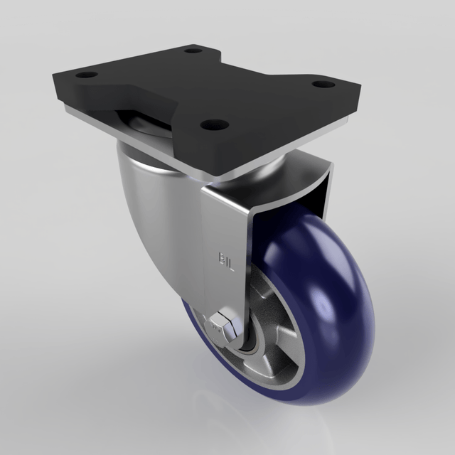 Pressed steel swivel castor with a top plate fixing fitted with a ergonomic blue 75 shore A polyurethane tyre on aluminium centred wheel with ball bearings. Wheel diameter 150mm, tread width 50mm, overall height 204mm, top plate 135mm x 110mm, hole centres 105mm x 80mm. Load capacity 500kg at 4kph and 190kg at 16kph