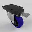 Pressed steel swivel castor with a top plate fixing fitted with a blue 65 shore A elastic rubber tyre on a black nylon centred wheel with ball bearings and a fixed position brake. Wheel diameter 150mm, tread width 40mm, overall height 204mm, top plate 180mm x 115mm, hole centres 105mm x 80mm. Load capacity 400kg.