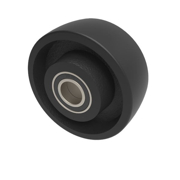 Cast iron wheel with ball bearings. Wheel diameter 125mm, tread width 50mm, bore size 25.4mm, hub length 60mm. Load capacity 550kg.