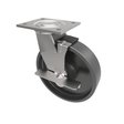 fabricated swivel castor with a top plate fixing fitted with a black cast iron wheel with plain bore and a side fitting wheel brake. Wheel diameter 200mm, tread width 50mm, overall height 240mm, top plate 135mm x 110mm, hole centres 105mm x 80mm. Load capacity 600kg.