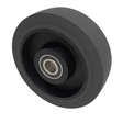 200mm diameter black elastic rubber tyred on a cast iron centred wheel with ball bearings. Tread width 60mm, bore 25mm, hub 60mm. Load capacity 600kg.