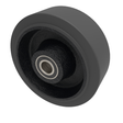 200mm diameter black 65 shore A elastic speed rubber tyred on a cast iron centred wheel with ball bearings. Tread width 75mm, bore 25.4mm, hub 83mm. Load capacity 650kg at 4kph and 228kg at 20kph.