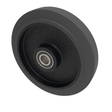 250mm diameter black 65 shore A elastic speed rubber tyred on a cast iron centred wheel with ball bearings. Tread width 50mm, bore 25.4mm (1"), hub 60mm. Load capacity 550kg at 4kph and 190kg at 20kph.