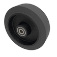 250mm diameter black 65 shore A elastic speed rubber tyred on a cast iron centred wheel with ball bearings. Tread width 75mm, bore 25mm, hub 83mm. Load capacity 800kg at 4kph and 280kg at 20kph