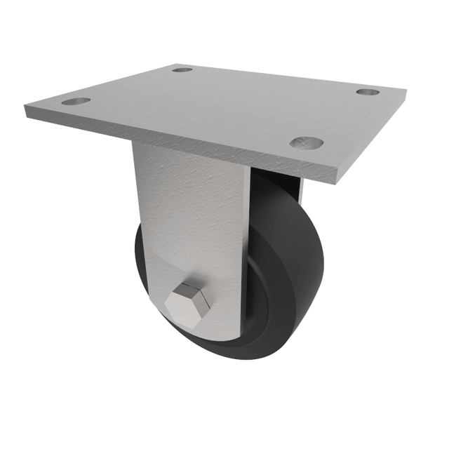 Fabricated fixed castor with a top plate fixing fitted with a black elastic rubber on black cast iron centred wheel with ball bearings. Wheel diameter 100mm, tread width 50mm, overall height 143mm, top plate 135mm x 110mm, hole centres 105mm x 80mm. Load capacity 210kg.