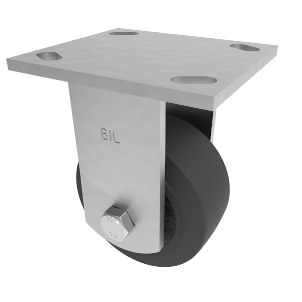 Fabricated fixed castor with a top plate fixing fitted with a black elastic rubber on black cast iron centred wheel with ball bearings. Wheel diameter 100mm, tread width 50mm, overall height 143mm, top plate 115mm x 102mm, hole centres 92mm x 67mm and 76mm x 76mm. Load capacity 210kg.