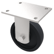 Fabricated fixed castor with a top plate fixing fitted with a black elastic rubber tyred on cast iron centred wheel with ball bearings. Wheel diameter 150mm, tread width 50mm, overall height 200mm, top plate 150mm x 110mm, hole centres 105mm x 80mm or 121mm x 59mm. Load capacity 300kg.