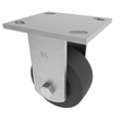 Fabricated fixed castor with a top plate fixing fitted with a black elastic rubber tyred cast iron centred wheel with ball bearing. Wheel diameter 150mm, tread width 50mm, overall height 190mm, top plate 115mm x 102mm, hole centres 92mm x 67mm and 76mm x 76mm. Load capacity 350kg.