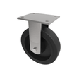 Fabricated fixed castor with a top plate fixing fitted with a black elastic rubber tyred cast iron centred wheel with ball bearings. Wheel diameter 200mm, tread width 50mm, overall height 240mm, top plate 135mm x 110mm, hole centres 105mm x 80mm. Load capacity 400kg.