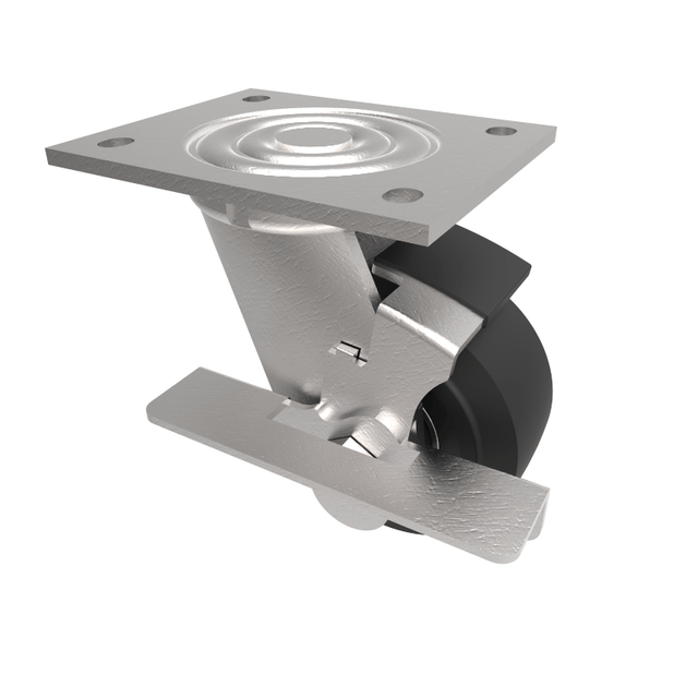 Fabricated swivel castor with a top plate fixing fitted with a black elastic rubber on black cast iron centred wheel with ball bearings and side fitting wheel brake. Wheel diameter 100mm, tread width 50mm, overall height 143mm, top plate 135mm x 110mm, hole centres 105mm x 80mm. Load capacity 210kg.