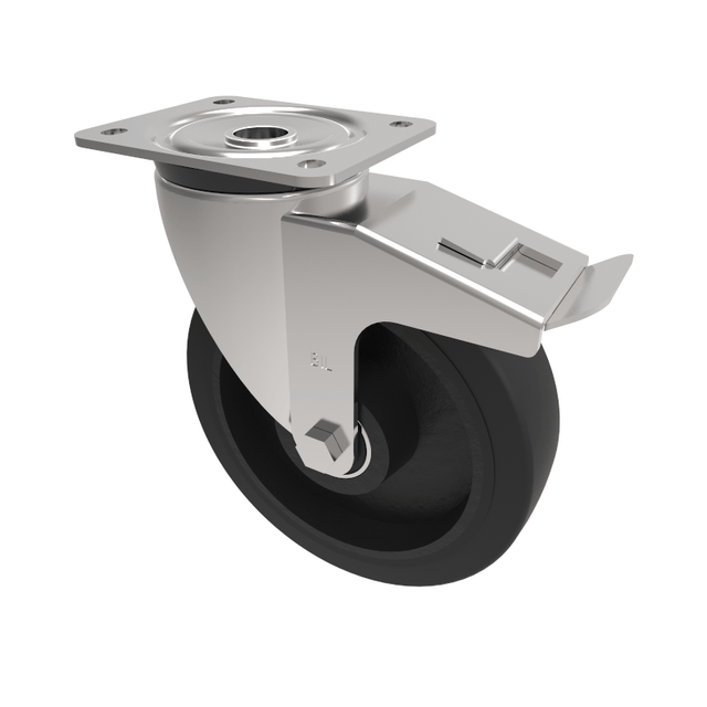 Pressed streel swivel castor with a top plate fixing fitted with a black elastic rubber wheel on a cast iron centre with ball bearings and totall kswivel wheel brake. Wheel diameter 200mm, tread width 50mm, overall height 238mm, top plate 135mm x 110mm, hole centres 105mm x 80/75mm. Load capacity 450kg.