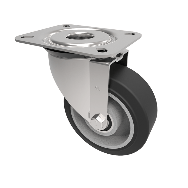 Pressed steel swivel castor top plate fixing fitted with a black high elastic natural 65 shore A rubber tyre aluminium centred wheel with ball bearings. Wheel diameter 100mm, tread width 40mm, overall height 128mm, top plate 105mm x 85mm, hole centre 80mm x 60mm or 72mm x 52mm. Load capacity 180kg.REACH compliant also PAH-Free rubber to confirm to EU-directive 2005/69/EC