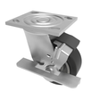 Fabricated swivel castor with a top plate fixing fitted with a black high elastic natural 65 shore A rubber tyred aluminium centred wheel with ball bearings and a side fitting wheel brake. Wheel diameter 200mm, tread width 50mm, overall height 240mm, top plate 115mm x 102mm, hole centres 92mm x 67mm and 76mm x 76mm. Load capacity 500kg.REACH compliant also PAH-Free rubber to confirm to EU-directive 2005/69/EC