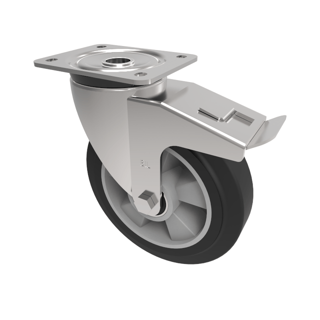 Pressed steel swivel castor with a top plate fixing fitted with a black high elastic natural 65 shore A rubber tyred on an aluminium centred wheel with ball bearing and total lock brake. Wheel diameter 200mm, tread width 50mm, overall height 238mm, top plate 135mm x 110mm, hole centres 105mm x 80/75mm. Load capacity 500kg. REACH compliant also PAH-Free rubber to confirm to EU-directive 2005/69/EC