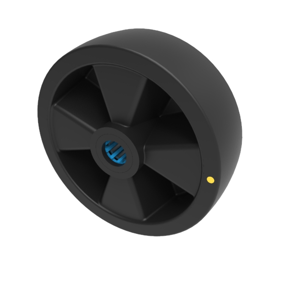 Black electrically conductive nylon wheel with stainless steel roller bearings. Wheel diameter 160mm, tread width 50mm, Hub width 59mm, Bore size 20mm. Load capacity 325kg Conductive offers a resistance R<10000 Ohm **MANUFACTURED TO ORDER**