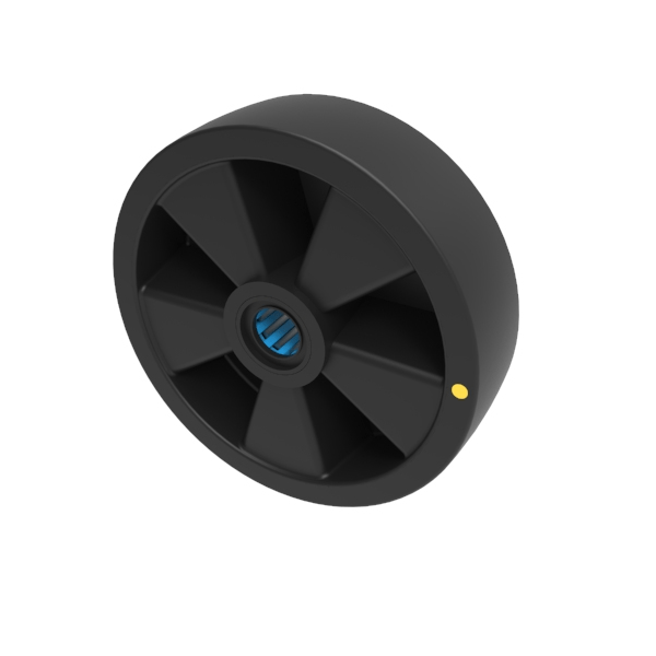 Black electrically conductive nylon wheel with stainless steel roller bearings. Wheel diameter 200mm, tread width 57mm, Hub width 59mm, Bore size 25mm. Load capacity 520kg Conductive offers a resistance R<10000 Ohm. **MANUFACTURED TO ORDER**