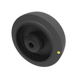 Electrically conductive 65 shore A black elastic rubber tyre on a black nylon centre wheel with a ball bearing .Diameter 125mm, Tread width 36mm, bore 10mm, hub 42mm. Load capacity 250kg.Conductivity range is 10^3 ohm to 10^4 ohm